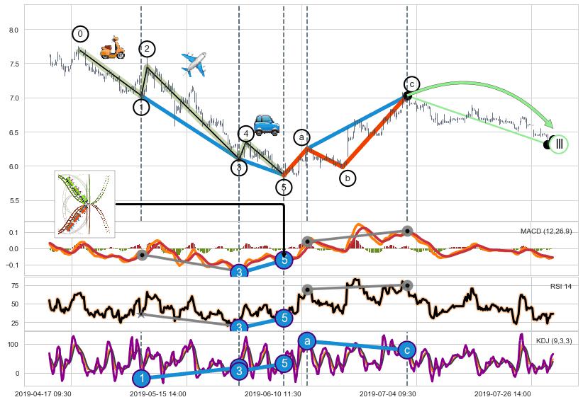 ➣ 1,3,5驱动浪MACD, RSI, KDJ走势都出现【常规背离】反转信号增强