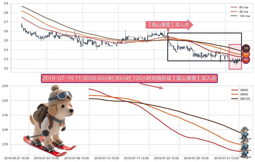 ⚀ 2019-07-08 15:00:00小时-2019-07-31 15:00:00小时显现 60小时-90小时-120小时均线 【高山滑雪】买入点 看多信号,后市看涨,买入