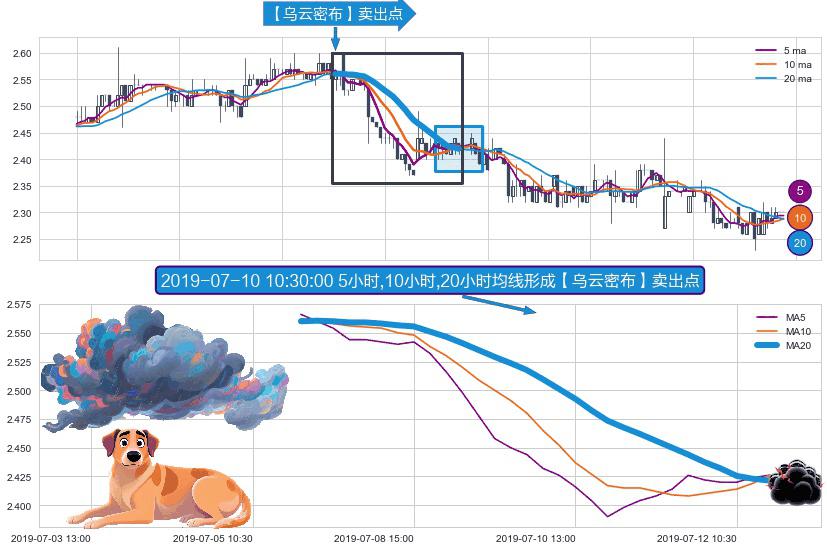 ⚀ 2019-07-05 14:00:00小时-2019-07-12 14:00:00小时显现 5小时-10小时-20小时均线 【乌云密布】卖出点 看空信号,后市看跌,卖出