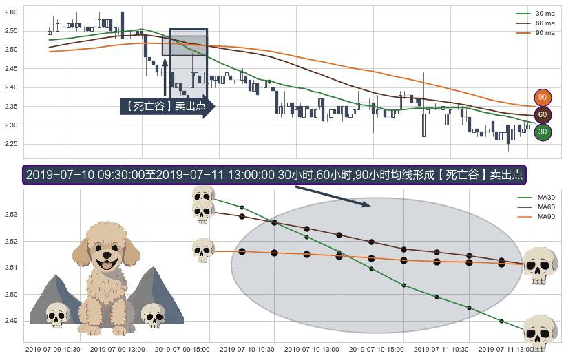 ⚀ 2019-07-10 10:30:00-小时至2019-07-11 13:00:00-小时显现 30小时-60小时-90小时均线 【死亡谷】卖出点 看空信号,后市看跌,卖出