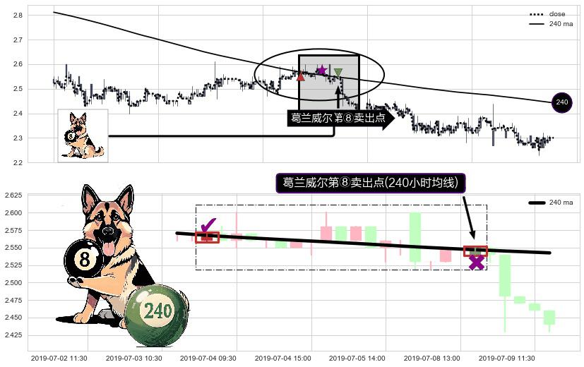 ⚀ 2019-07-08 14:00:00-小时显现 葛兰威尔均线 240小时均线 第⑧卖出点 下降趋势的中继信号,后市看跌,卖出信号