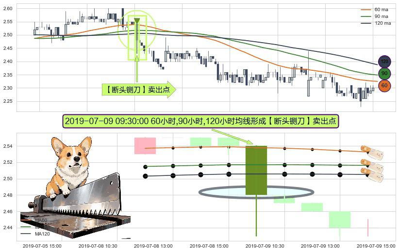 ⚀ 2019-07-09 09:30:00小时显现 60小时-90小时-120小时均线 【断头铡刀】卖出点 看空信号,后市看跌,卖出