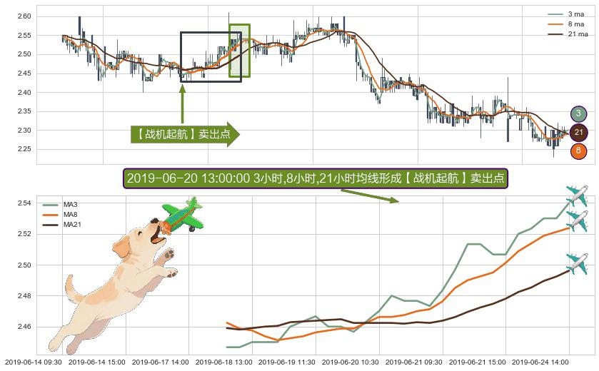 ⚀ 2019-06-18 10:30:00小时-2019-06-24 14:00:00小时显现 3小时-8小时-21小时均线 【战机起航】卖出点 看空信号,后市看跌,卖出