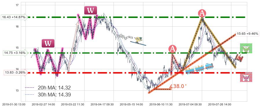 ♘ 阻力价格位14.75,可信任强度78.53%,距离最后交易2019-07-31 15:00形成的收盘价格14.30相差 +3.16%