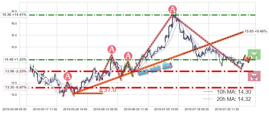 ♘ 阻力价格位14.48,可信任强度67.10%,距离最后交易2019-07-31 15:00形成的收盘价格14.30相差 +1.23%