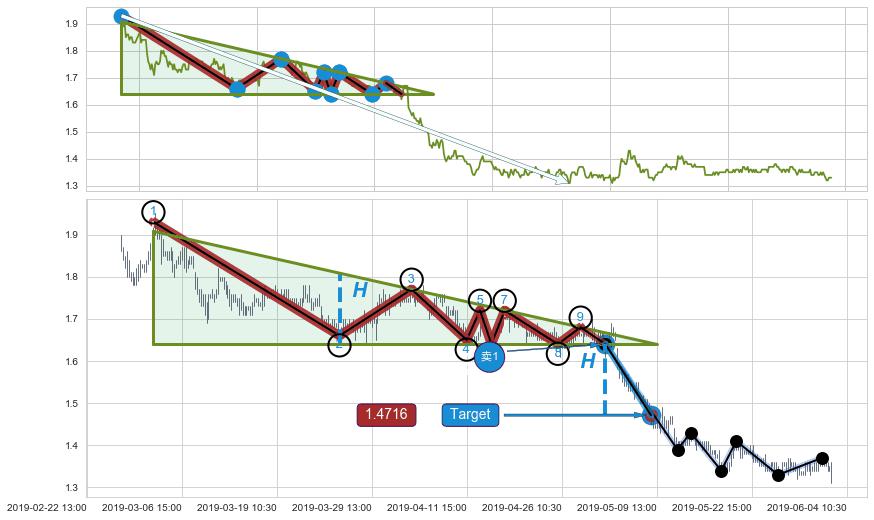 ➣ 最小中继整理跌幅→𝐇: 0.168427 (下侧直角边第一支撑点②与斜边垂直距离)