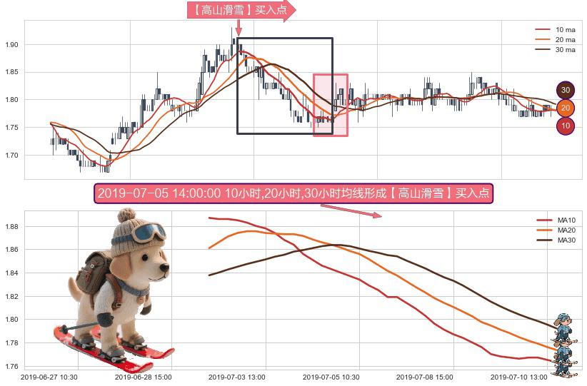 ⚀ 2019-07-02 13:00:00小时-2019-07-10 14:00:00小时显现 10小时-20小时-30小时均线 【高山滑雪】买入点 看多信号,后市看涨,买入
