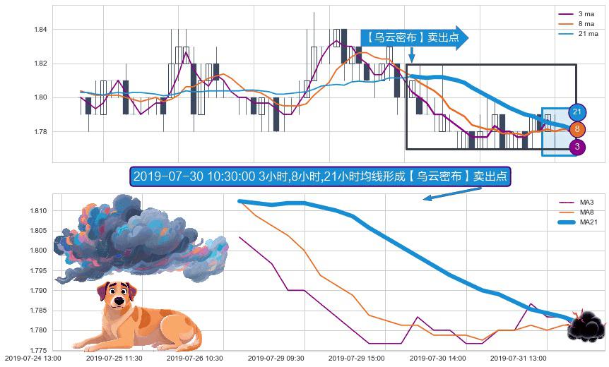 ⚀ 2019-07-26 11:30:00小时-2019-07-31 15:00:00小时显现 3小时-8小时-21小时均线 【乌云密布】卖出点 看空信号,后市看跌,卖出