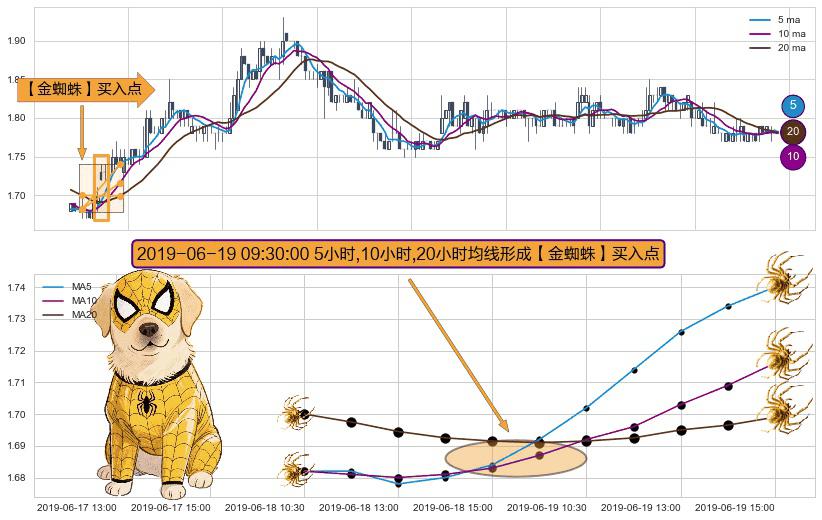 ⚀ 2019-06-19 09:30:00小时显现 5小时-10小时-20小时均线 【金蜘蛛】买入点 看多信号,后市看涨,买入