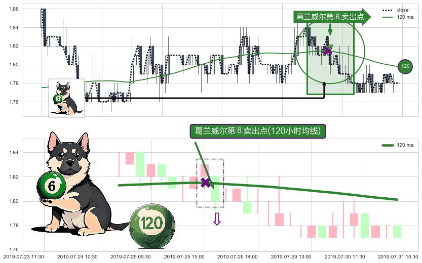 ⚀ 2019-07-26 09:30:00-小时显现 葛兰威尔均线 120小时均线 第⑥卖出点 走势反转见顶信号,后市看跌,卖出信号