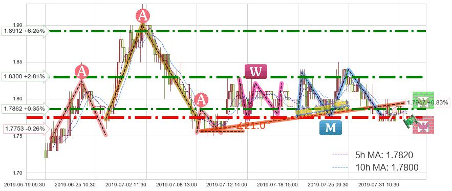 ♘ 阻力价格位1.8912,可信任强度72.13%,距离最后交易2019-07-31 15:00形成的收盘价格1.7800相差 +6.25%