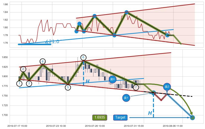 ➣ 最小中继整理涨幅→𝐇: 0.0500000 (上平行阻力线与下平行支撑线的垂直距离)