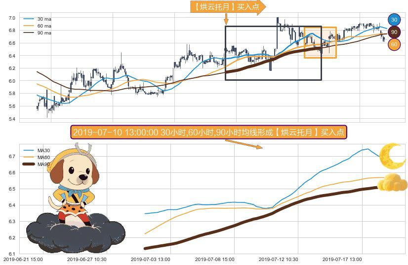 ⚀ 2019-07-02 10:30:00小时-2019-07-18 15:00:00小时显现 30小时-60小时-90小时均线 【烘云托月】买入点 看多信号,后市看涨,买入
