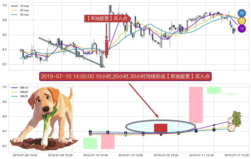 ⚀ 2019-07-10 14:00:00小时显现 10小时-20小时-30小时均线 【旱地拔葱】买入点 看多信号,后市看涨,买入