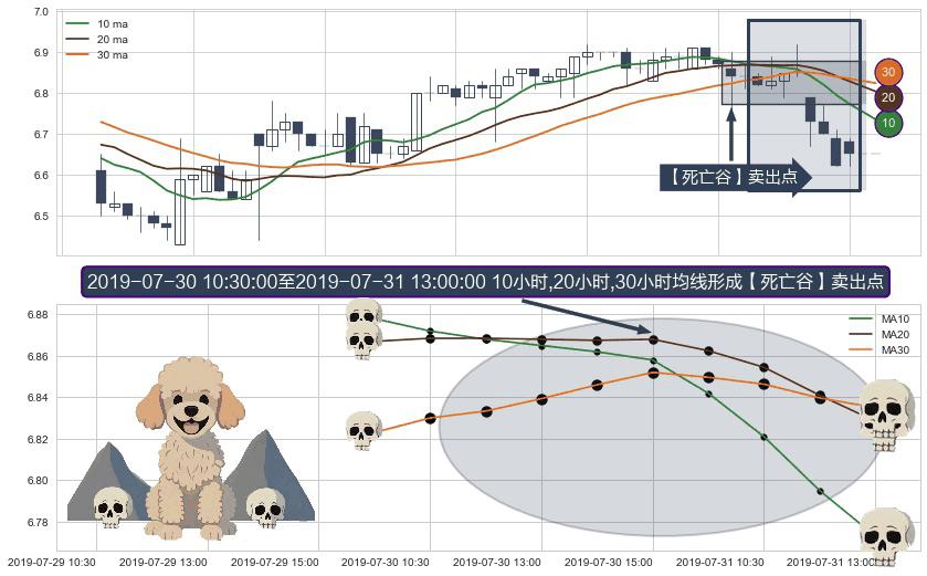 ⚀ 2019-07-30 11:30:00-小时至2019-07-31 13:00:00-小时显现 10小时-20小时-30小时均线 【死亡谷】卖出点 看空信号,后市看跌,卖出