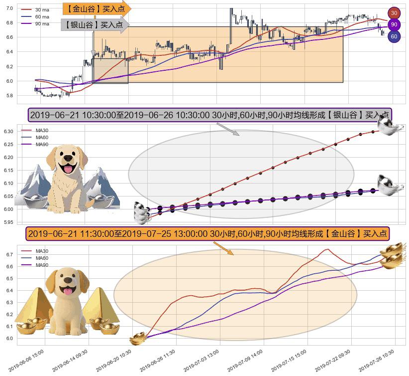 ⚀ 2019-06-21 13:00:00-小时至2019-07-25 13:00:00-小时显现 30小时-60小时-90小时均线 【金山谷】买入点 其再次确认了买入信号,可靠性更强,买入