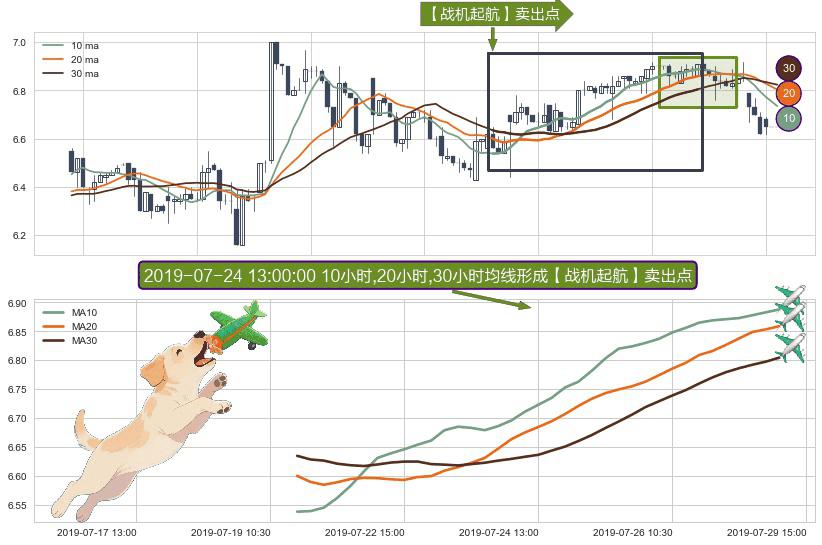 ⚀ 2019-07-19 13:00:00小时-2019-07-29 13:00:00小时显现 10小时-20小时-30小时均线 【战机起航】卖出点 看空信号,后市看跌,卖出