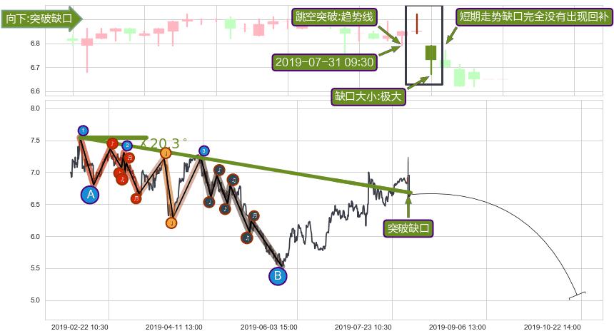 从2019-02-08 10:30至2019-06-24 09:30,共包含540个小时,阶段股价下跌-13.50%,阶段股价变动位移路程比: 1 : 27,下跌趋势角度: 20.3,2019-03-25 09:30向↘︎形成缺口,跳空下跌-7.23%˚