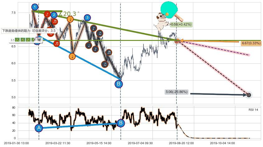 ♘ 阻力价格位6.81,可信任强度72.66%,距离最后交易2019-07-31 15:00形成的收盘价格6.65相差 +2.37%