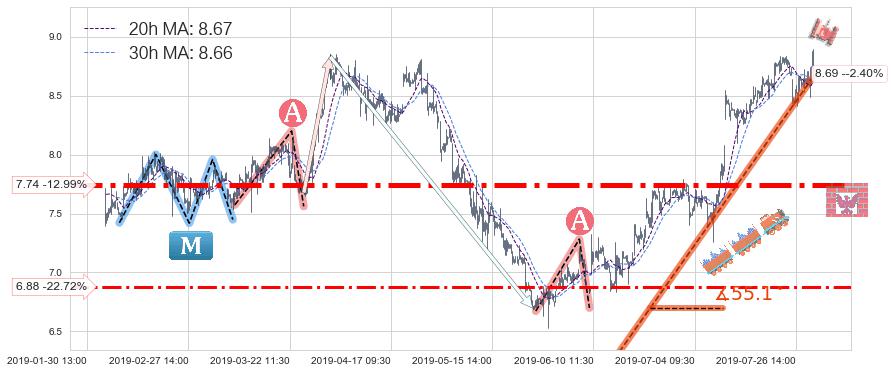 ♘ 支撑价格位7.74,可信任强度86.05%,距离最后交易2019-07-31 15:00形成的收盘价格8.90相差 -12.99%