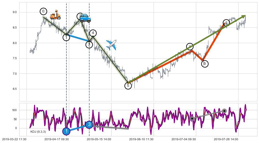 从2019-05-24 11:30至2019-06-06 14:00,共包含57个小时,阶段股价上涨2.32%,阶段股价变动位移路程比: 1 : 10