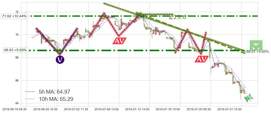 ♘ 在最后的下跌阶段2019-07-04 13:00至2019-07-31 15:00,存在 持续未破位的阻力位 ,阻力价格68.51,可信任强度80.46%,其距离最后价格64.85相差 +5.65%