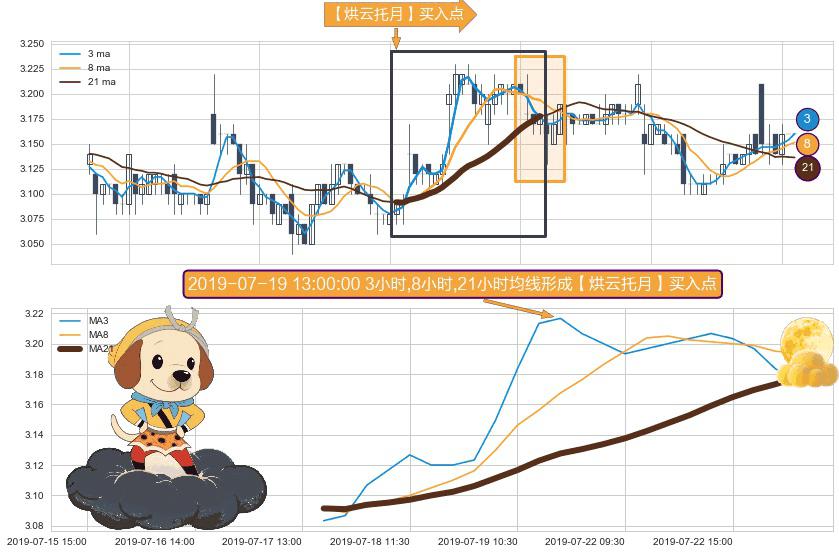 形态多维评估: ⚀ 2019-07-17 14:00:00小时-2019-07-23 11:30:00小时显现 3小时-8小时-21小时均线 【烘云托月】买入点 看多信号,后市看涨,买入