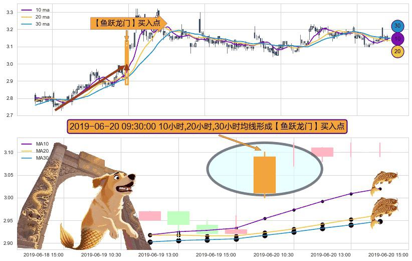 形态多维评估: ⚀ 2019-06-20 09:30:00小时显现 10小时-20小时-30小时均线 【鱼跃龙门】买入点 看多信号,后市看涨,买入