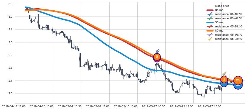 下跌趋势04-18 13:00-05-29 11:30,均线89, 85, 55确认关键阻力2处