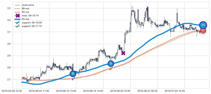 上涨趋势05-28 10:30-07-08 13:00,均线55确认关键支撑2处