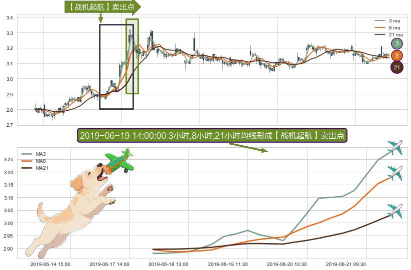 形态多维评估: ⚀ 2019-06-18 09:30:00小时-2019-06-21 11:30:00小时显现 3小时-8小时-21小时均线 【战机起航】卖出点 看空信号,后市看跌,卖出