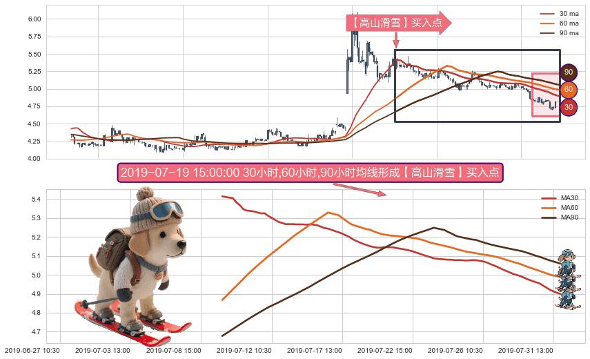 形态多维评估: ⚀ 2019-07-09 15:00:00小时-2019-07-31 15:00:00小时显现 30小时-60小时-90小时均线 【高山滑雪】买入点 看多信号,后市看涨,买入