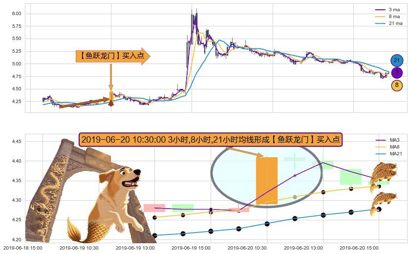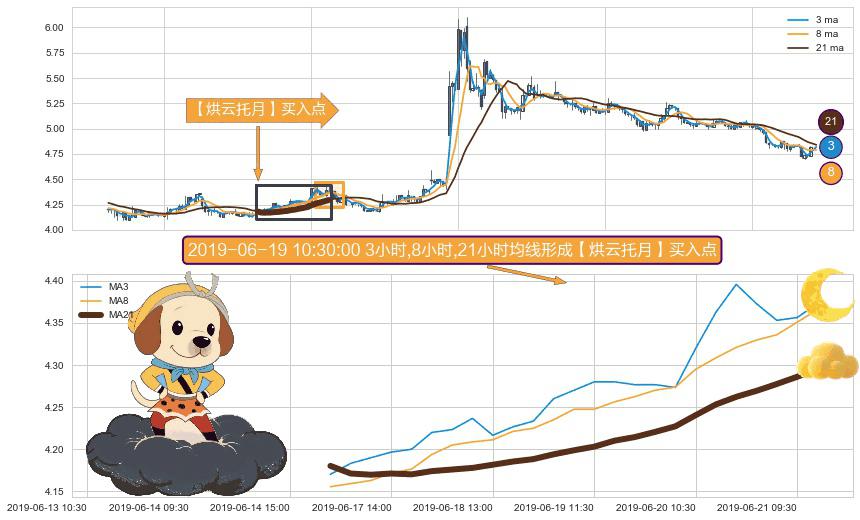 形态多维评估: ⚀ 2019-06-17 10:30:00小时-2019-06-21 10:30:00小时显现 3小时-8小时-21小时均线 【烘云托月】买入点 看多信号,后市看涨,买入