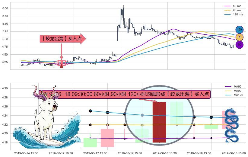 形态多维评估: ⚀ 2019-06-18 09:30:00小时显现 60小时-90小时-120小时均线 【蛟龙出海】买入点 看多信号,后市看涨,买入