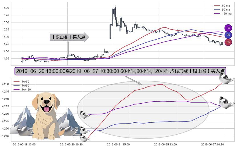 形态多维评估: ⚀ 2019-06-20 14:00:00-小时至2019-06-27 10:30:00-小时显现 60小时-90小时-120小时均线 【银山谷】买入点 看多信号,后市看涨,买入