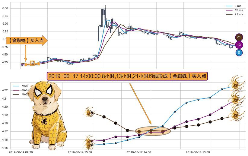 形态多维评估: ⚀ 2019-06-17 14:00:00小时显现 8小时-13小时-21小时均线 【金蜘蛛】买入点 看多信号,后市看涨,买入