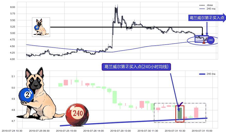 形态多维评估: ⚀ 2019-07-31 09:30:00-小时显现 葛兰威尔均线 240小时均线 第②买入点 上升趋势的中继信号,后市看涨,买进信号
