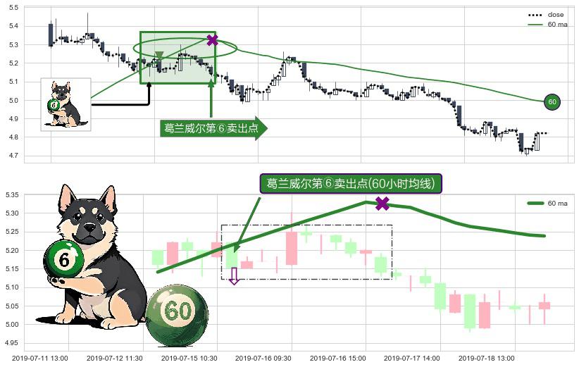 形态多维评估: ⚀ 2019-07-15 11:30:00-小时显现 葛兰威尔均线 60小时均线 第⑥卖出点 走势反转见顶信号,后市看跌,卖出信号