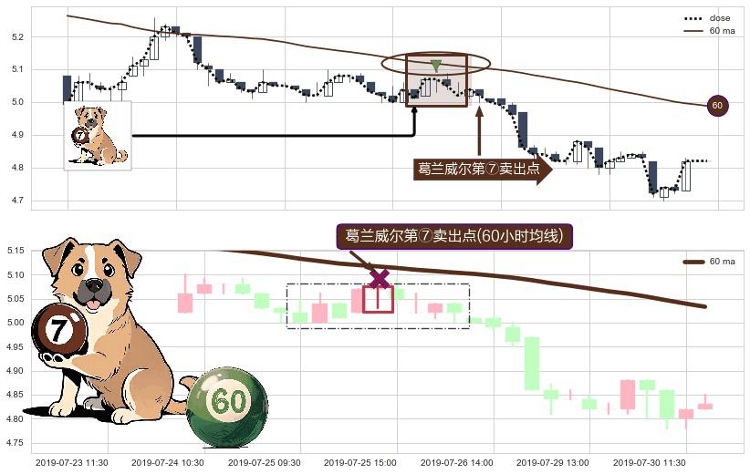 形态多维评估: ⚀ 2019-07-25 14:00:00-小时显现 葛兰威尔均线 60小时均线 第⑦卖出点 下降趋势的中继信号,后市看跌,卖出信号