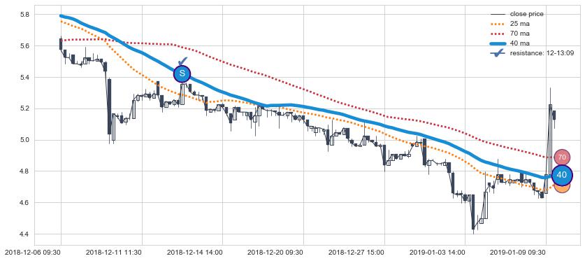 下跌趋势04-15 11:30-05-16 14:00,均线40, 70确认关键阻力1处