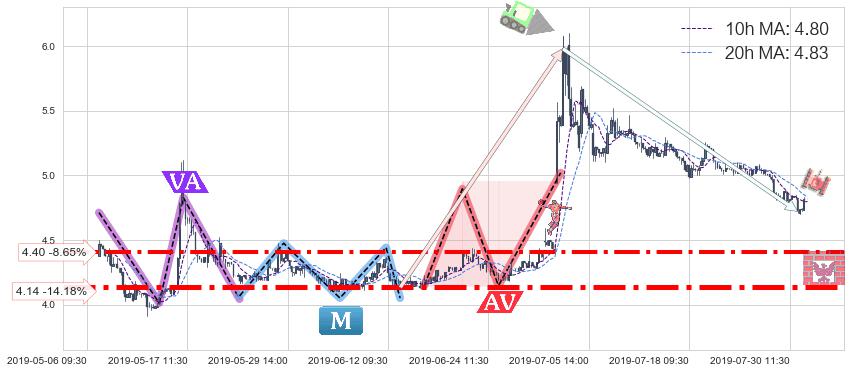 ♘ 支撑价格位4.40,可信任强度70.61%,距离最后交易2019-07-31 15:00形成的收盘价格4.82相差 -8.65%