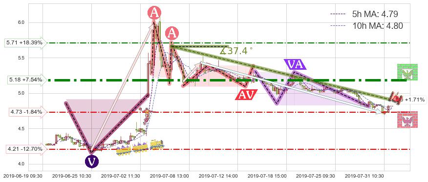 ➣ 预测:2019-08-06 15:00,【继续下探】稳定目前下跌趋势的前提下,预测价格:4.56