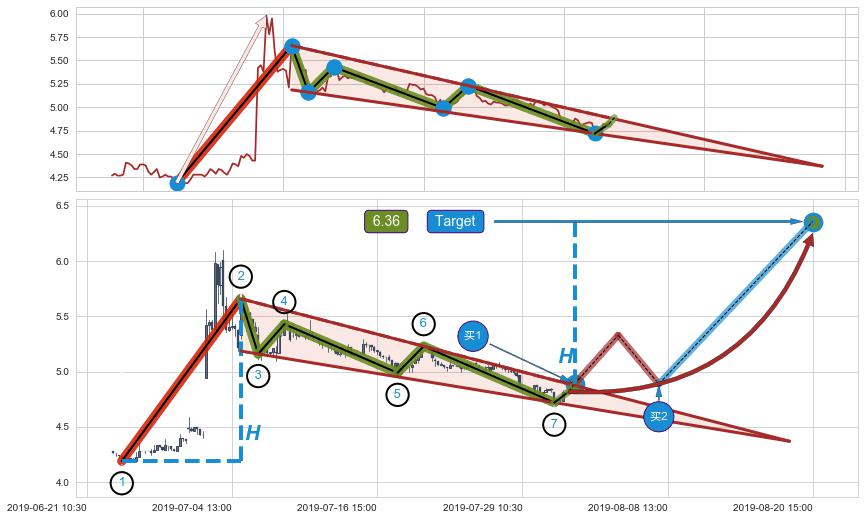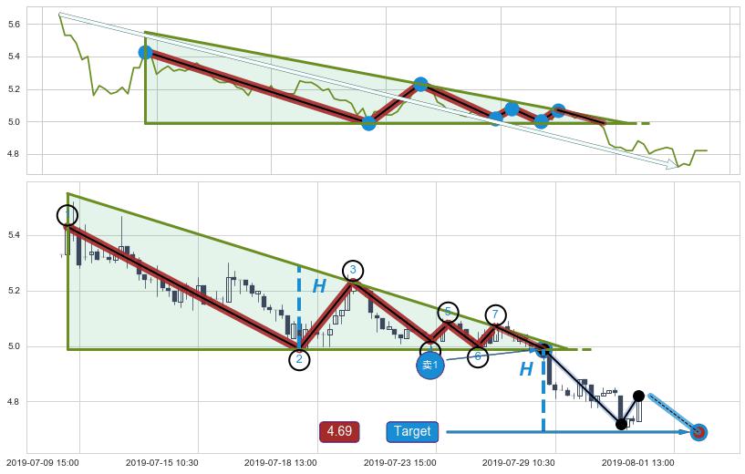 ➣ 最小中继整理跌幅→𝐇: 0.30000 (下侧直角边第一支撑点②与斜边垂直距离)