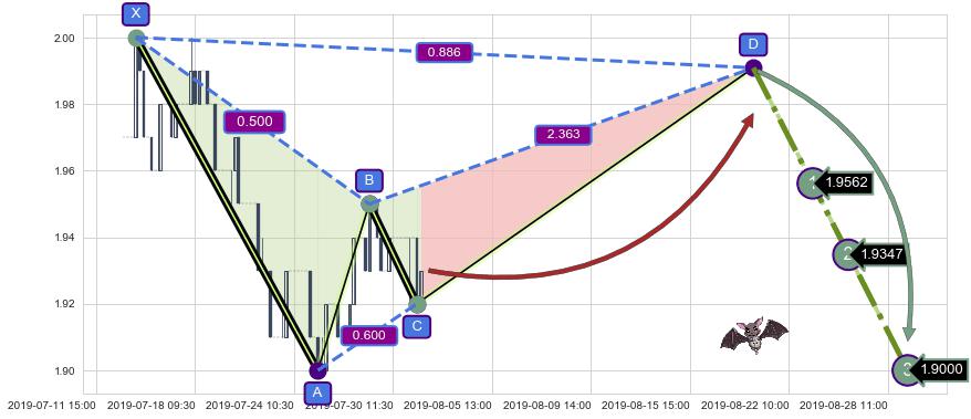 ➣ 未完成【蝙蝠】形态起点X: 07-15:13, 已到达C点: 07-31:11, 预测最终D点: 08-20:13, 共155交易小时