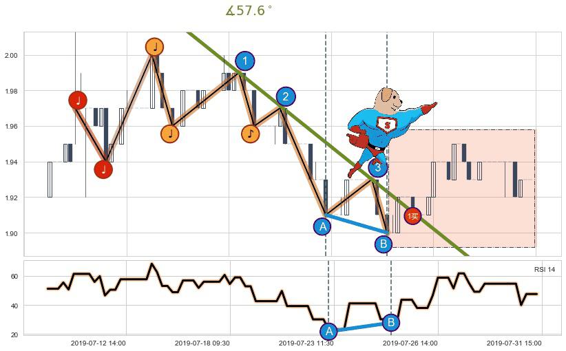从2019-07-15 13:00至2019-07-26 13:00,共包含55个小时,阶段股价下跌-4.02%,阶段股价变动位移路程比: 1 : 3,下跌趋势角度: 59.5