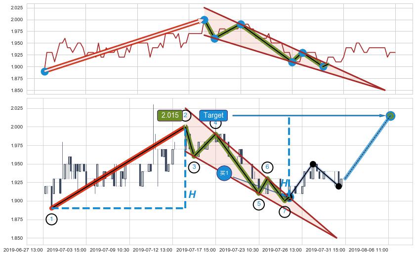 ➢ 最小中继整理涨幅→𝐇: 0.110000 (𝐇楔型旗杆的长度:楔型起点→顶点)