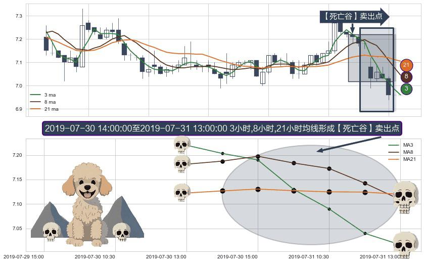 形态多维评估: ⚀ 2019-07-30 15:00:00-小时至2019-07-31 13:00:00-小时显现 3小时-8小时-21小时均线 【死亡谷】卖出点 看空信号,后市看跌,卖出