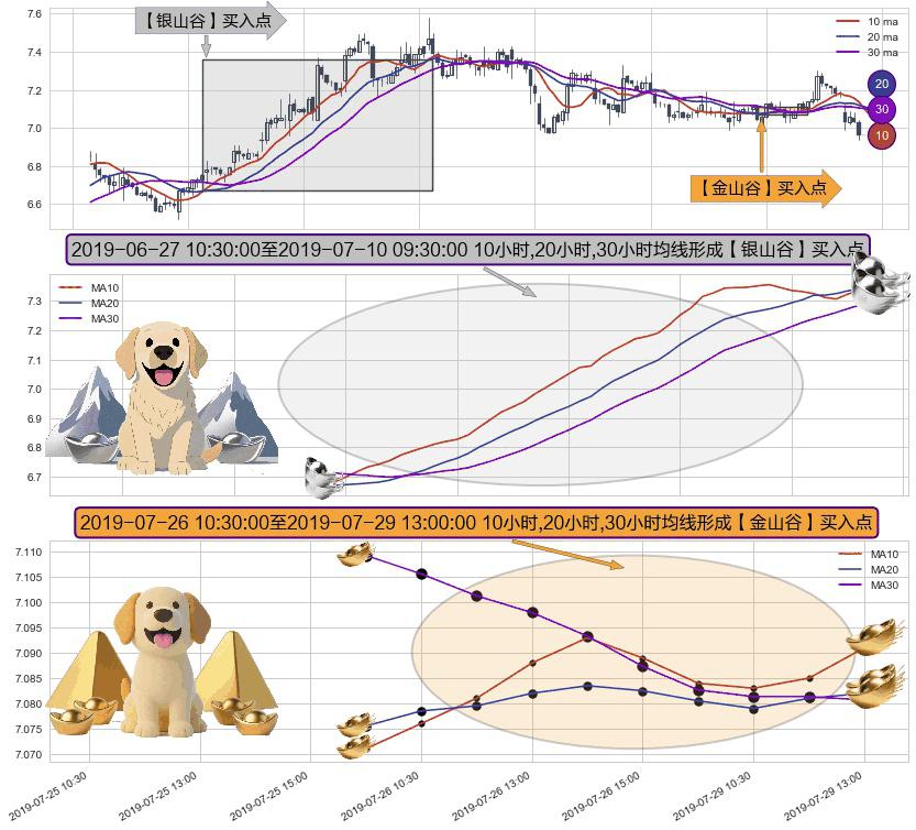形态多维评估: ⚀ 2019-07-26 11:30:00-小时至2019-07-29 13:00:00-小时显现 10小时-20小时-30小时均线 【金山谷】买入点 其再次确认了买入信号,可靠性更强,买入