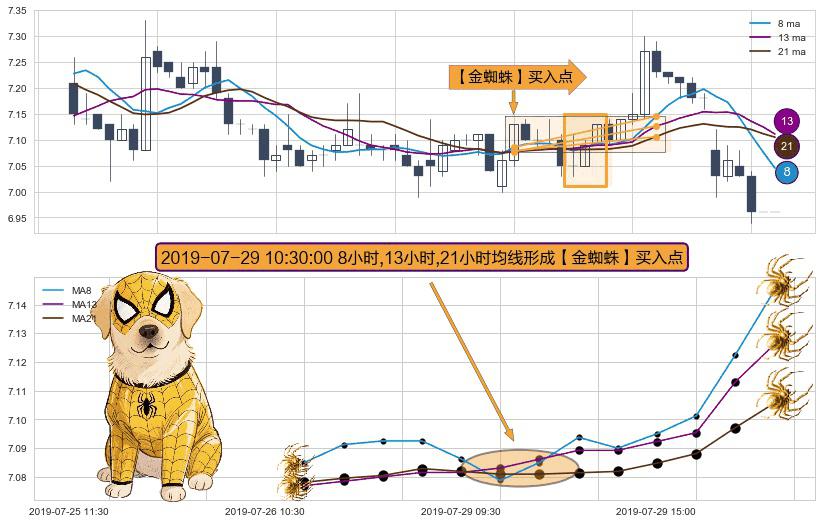 形态多维评估: ⚀ 2019-07-29 10:30:00小时显现 8小时-13小时-21小时均线 【金蜘蛛】买入点 看多信号,后市看涨,买入