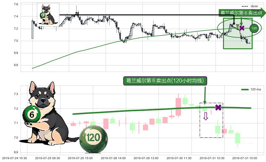 形态多维评估: ⚀ 2019-07-30 14:00:00-小时显现 葛兰威尔均线 120小时均线 第⑥卖出点 走势反转见顶信号,后市看跌,卖出信号